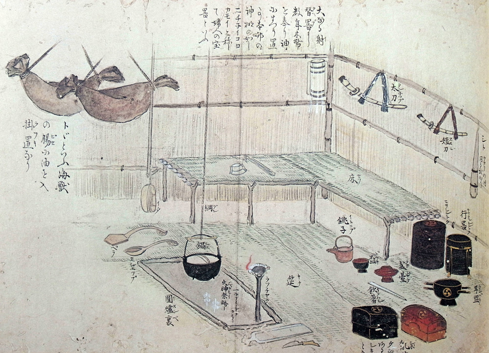 又大なる丹塗(ニヌリ)の桶に巴を画(カイ)て、酒造桶とて、[酉+央]酒をかみしてける具どももこゝ らとりならべ、ヰタシベのピセヰといひて、おほきやかなる壺蘆(ナリヒサゴ)の如き海獺(トド)の胃てふもの、あるは又大口魚(タラ)のヒセヰなど、みな魚の油を入て梁に掛つらね、ブヰ(えぞりゅうきんか)とて黒く乾たる草の根を編て柱にかけ、隔葱(ぎようじゃにんにく)といふものを刻み、象山貝母(シカカクレ, おおうぱゆり)の根を春て餅粢のごとくにして大なる酒樽に入れ、あるは小檜桶に入れて、あさタの糧とし、鹿のほじし、[魚+布](イルカ)のほじしやくひぬらん。