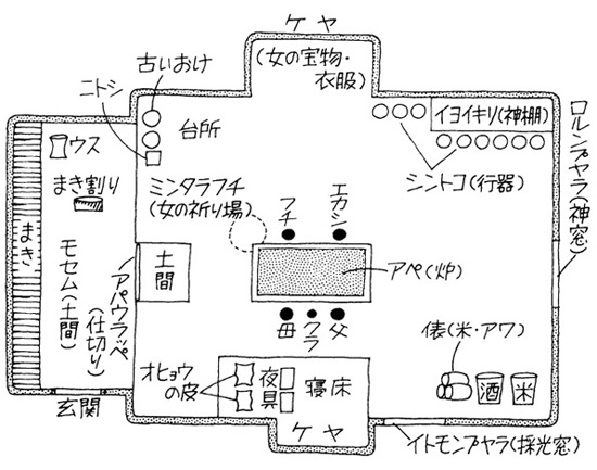 ロルンプヤラは、神から授けられた肉を運び込んだり、儀式の祭具を出し入れするための神窓で、窓の左手の壁には、守り神や祭事の用具、宝物、狩猟の道具類などを納めたイヨイキリ (神棚) があります。