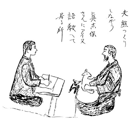 真志保さんは、熱心に、毎日欠かさず通ってきて、夫からアイヌ語を習っていました。物置でクマ彫りをしている夫の前に座り、ユーカラ(長編英雄叙事詩)やトゥイタック(昔話)を書いた紙をめくりながら、いろいろ聞くのです。