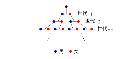 「100億人口の地球が,10万個必要」という数である。 はて,どうなっているのか? 答えは,「<父・母>溯行図の個体には,重複がある」である。 この重複が,先祖溯行したときの<先祖数の爆発的増加>を相殺している。 ──つぎは,最も簡単/極端な場合 (2個体集団の近親配偶): ![]()