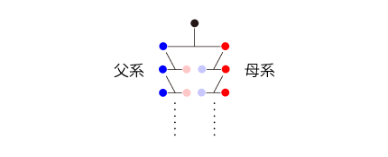出現の時間差がある。 こういうわけで,「<父・母>溯行図」は,実際には図的に想像できない。──よって,ただのことばである。 では「溯行図」は,どんなルールによるものが図的に想像可能となるか。 ここで,「父系図・母系図」の出番となる。 父系図は,自分 - 父 - 父の父 - 父の父の父 - ‥‥‥ と溯行するものである。 母系図は,自分 - 母 - 母の母 - 母の母の母 - ‥‥‥ と溯行するものである。 これは,ともに一本の線になるから,図的に想像可能である。 ![]() |