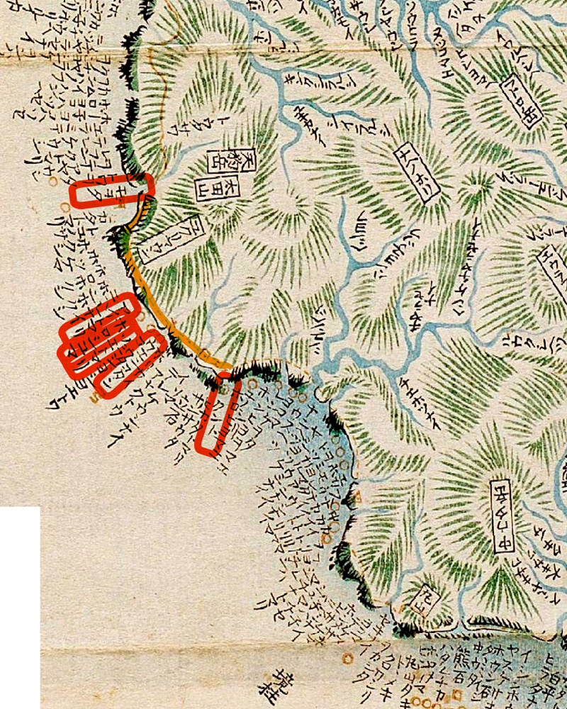 無水といふ崎の、巌のこゝらたちたる処をたどるたどる、こゝより宇多づたひにゆけと、浦人のみちをしへたり。