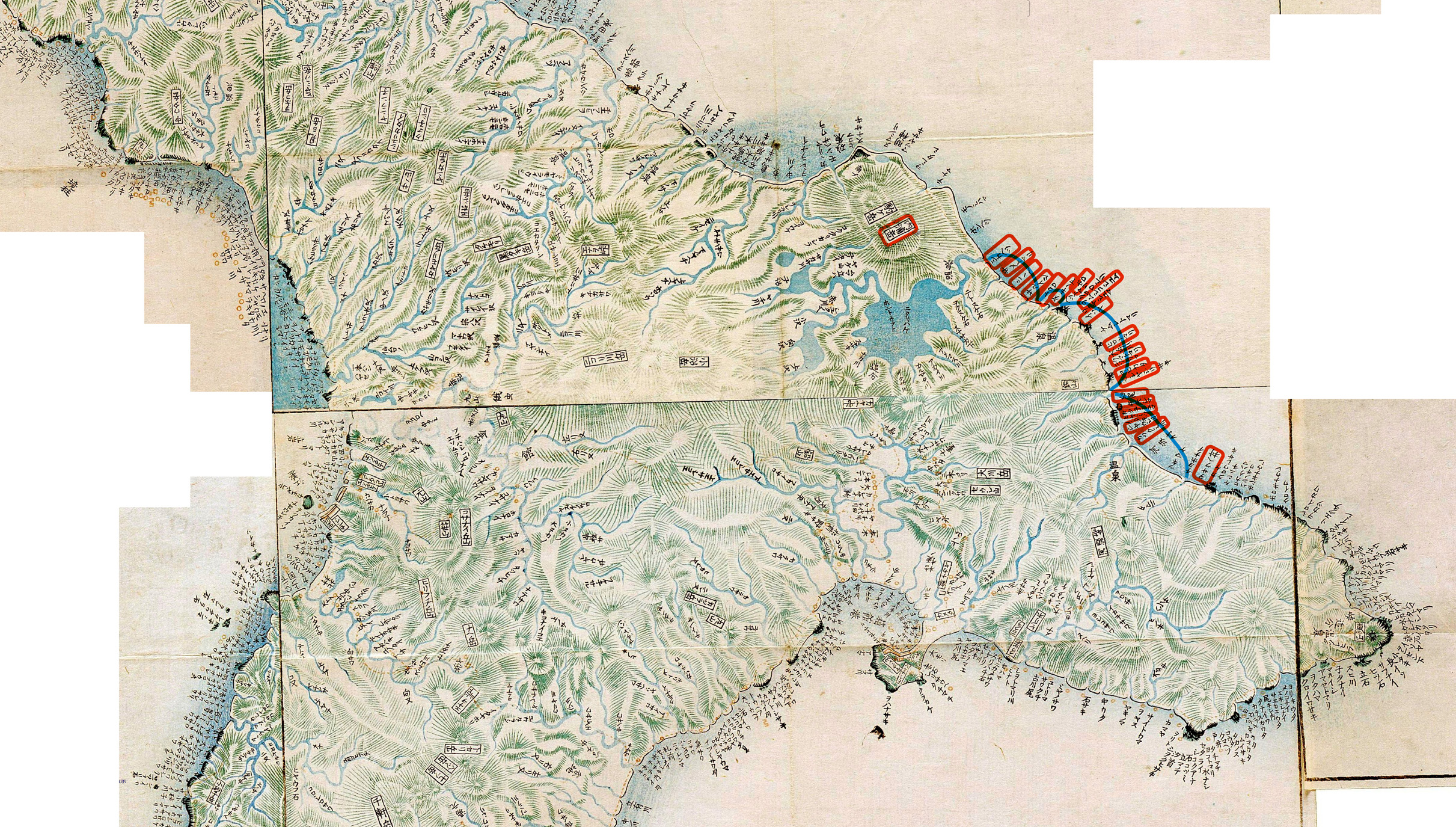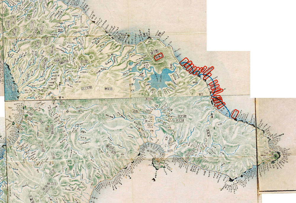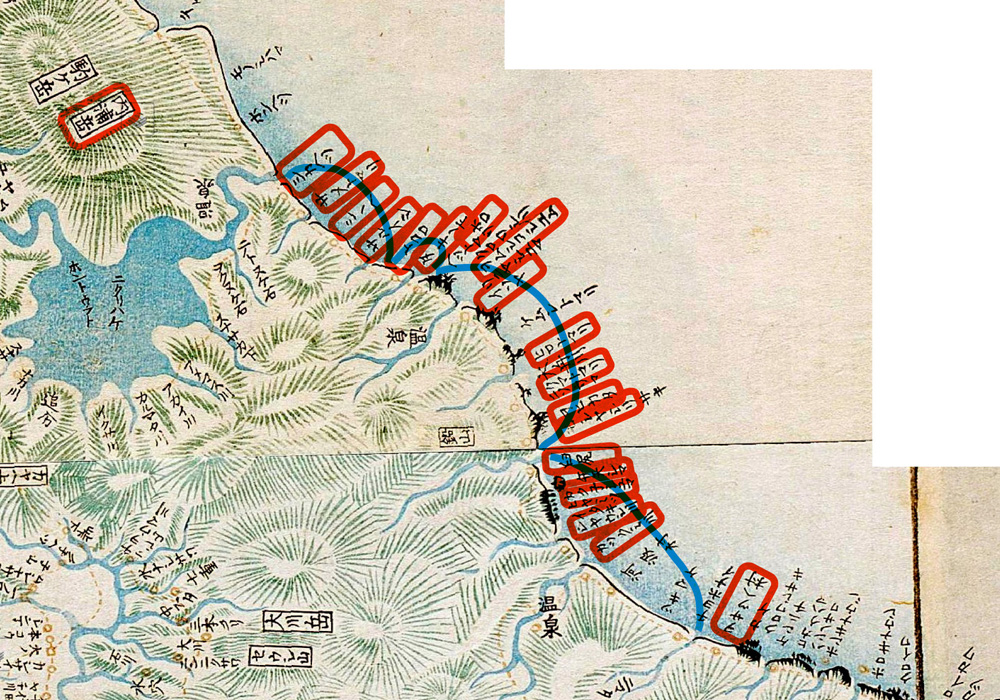(江差の湊にいと近き小山観音といふは,あらはゞきの神也。四郞隆政いくさきみとして勳をあらはし,あゆひひのとつおちたりしを,こゝに祭るという。又津刈の郡蒼杜の郷塘川のへたに,九郎義経の片脛□(脛巾,はばき) ここに齋ふ。處をシリベツの林といふ。又三河の國刀鹿の社のほとりにも,あらはゞきの神といふかみ社のあり。おなし神のところところに聞へ奉るものか。)