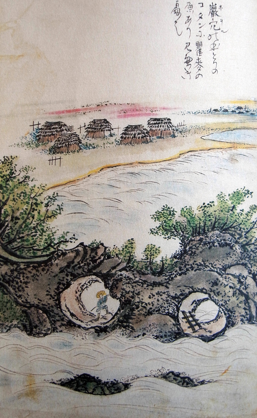 又見べき処のありといへば舟寄ていたれば、岩穴といひて、ひろきいはやどのあり。