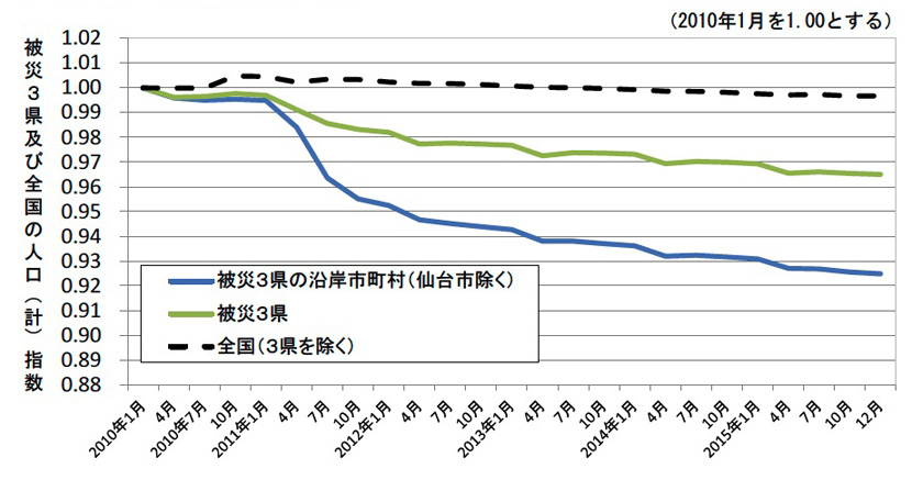 このグラフが示しているのは,「現役世代人口の減少」である。 実際,減少は,人が出て行ったからである。 出ていったのは,生計を立てるためである。 そして,生計を立てるために出て行く者は,現役世代である。 復興庁は,現役世代の流出を止められない。 市場経済は,官の出る幕ではないからである。 復興庁が「復興」を「復興事業の展開」に代えることには,理があるというわけである。 |