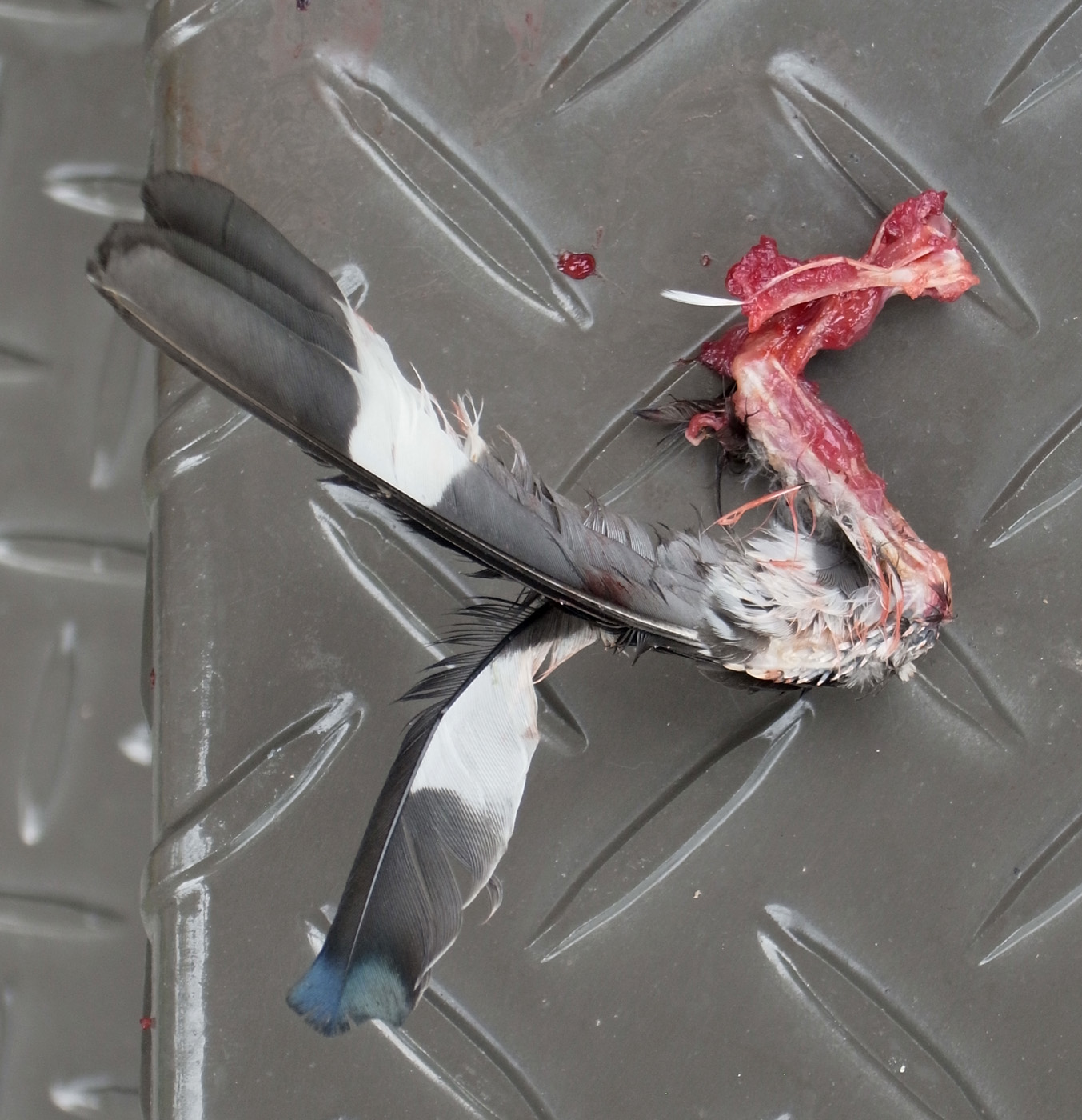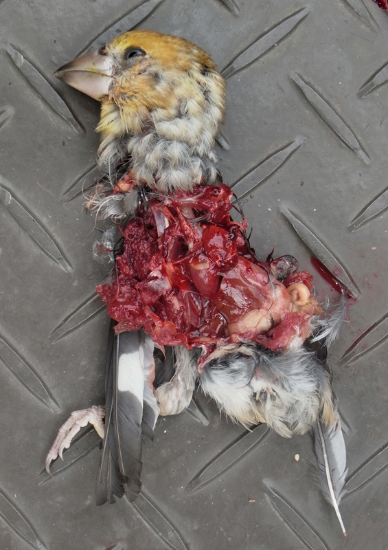 シメの雌と同定したのは,この死体の嘴の形状と,頭の色と,黒に白が入った羽根の色から。