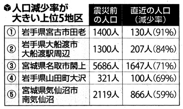 減少率が91%で最も大きい岩手県宮古市田老地区は、1400人から130人に減った。