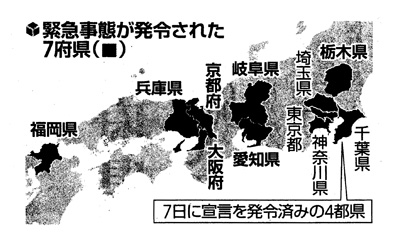 首相は7日の記者会見で、首都圏以外への宣言には否定的だったが、感染が各地に広まったことに加え、各知事からの要請を受けて、最終的に宣言区域の拡大に踏み切った。