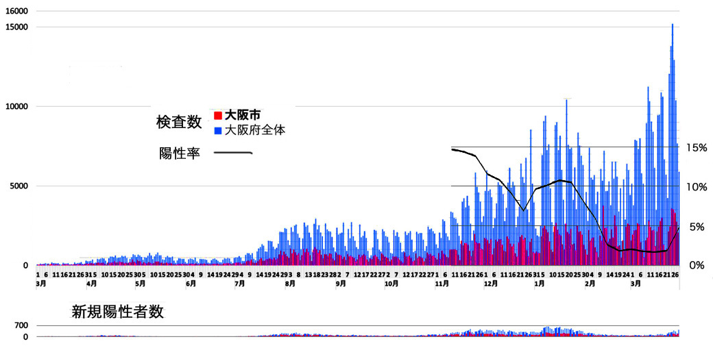 大阪府では3月31日、緊急事態宣言解除後で最多となる599人の新規感染者を確認。 宣言の発令に至った1月上旬に匹敵する人数となっている。