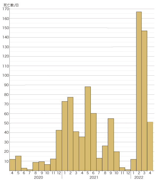 Up | 死亡数の推移 (累計と1日あたり) : 2022-04-30 まで | 作成: 2022-05-01 更新: 2022-05-01 |
