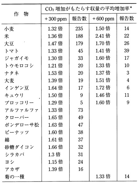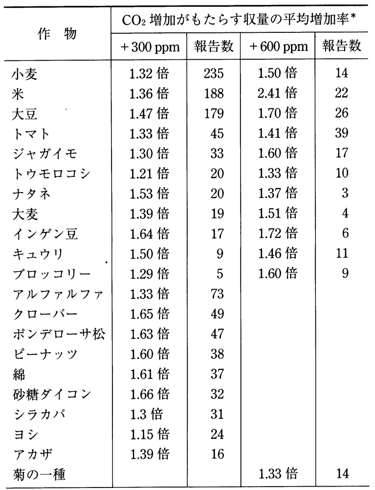 CO2 濃度を天然プラス 300ppm や 600ppm に上げると、どの作物も数十%レベルで収量が増す。