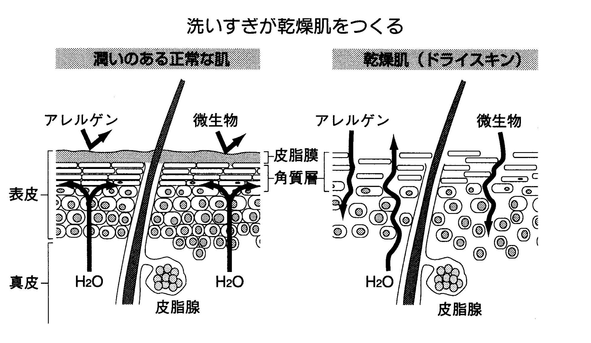 洗いすぎで問題となるのは、薄い膜を張って私たちの皮膚を守っている皮脂膜とその下の角質層だ。