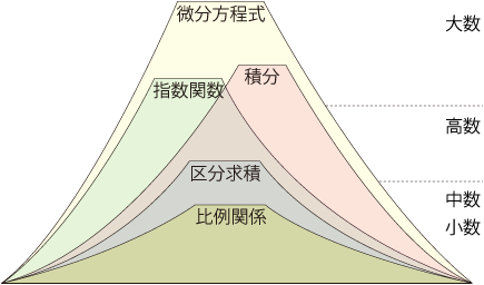 計算の方法を自らもっていない者は,ひとの言うことに頼るのみとなる。 放射能数値の安全/危険度の計算で必要となる数学は,基本的につぎのものである: 指数関数は,被曝量計算で「半減期」を扱うときに必要になる。 ──これは,高校数学理系の内容である。 積分は,放射線量の変化の曲線グラフから累積被曝量の変化の曲線グラフを手作業で導くときに,必要になる。 ──これは,高校数学理系の内容である。 微分方程式は,あるモデルに立って放射線量の変化や累積被曝量の変化を計算で導くときに,必要になる。 ──これは,大学数学の内容である。 放射能数値に対する安全/危険度の判断でどの程度主体的でいられるかは,これらの数学をどの程度修めているかに依存している。 ところで,数学は体系的である。 比例関係,区分求積,指数関数,積分それぞれの学習は,それぞれの裾野になるものの学習の累積である。 そして,これらの裾野全体は,学校数学全体になる: ![]() |