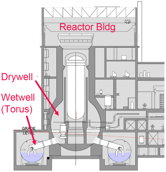 This cutaway diagram shows the central reactor vessel, thick concrete containment and lower torus structure in a typical boiling water reactor of the same era as Fukushima Daiichi 2
