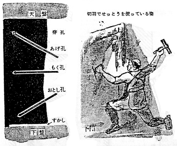 尺の鋼鉄製のたがねを炭壁に打ち込んで、深さ三尺程度の穴を幾つもあけ、つるはしで炭壁の下部に「すかし」を入れてから穴に火薬を詰め、これを爆発させて石炭を崩すので、この方法を「発破採炭」とも呼んだ。