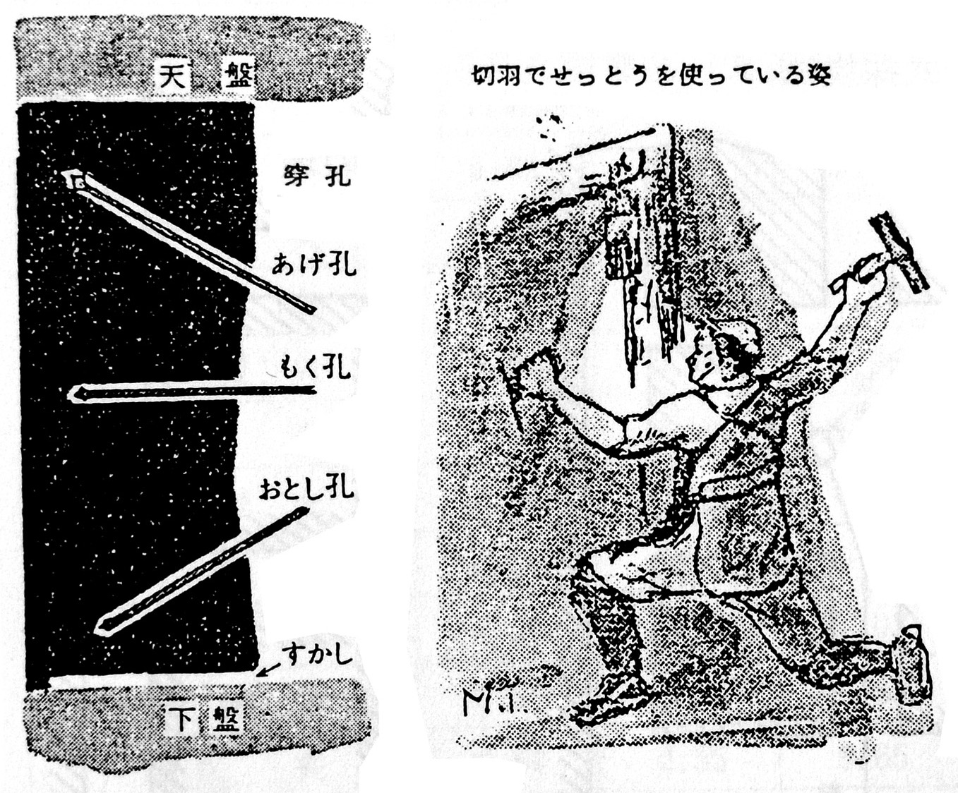 炭質の硬いところでは「たがね」と「せっとう」を用いた。
