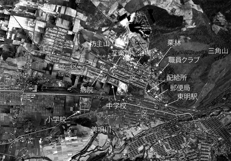 新美唄炭鉱の炭住はもともと現盤の沢町に集中していたが、近くに三菱美唄鉱の発電所があり、さらに戦時中に開かれた滝ノ沢坑の本格的採掘にともない、狭い谷合いはすでに飽和状態となっていたため、三井新美唄鉱では新築先を東明および落合町地区に求めていたのである。