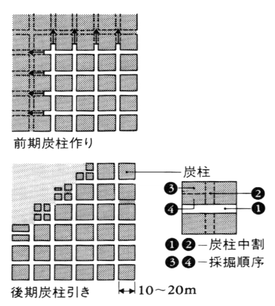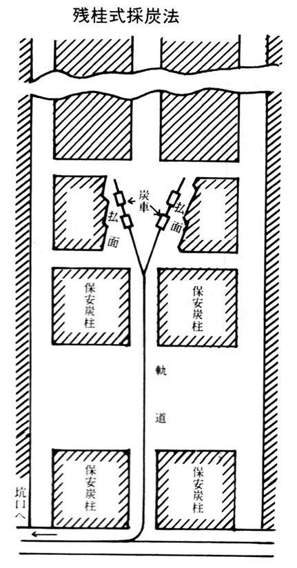 そして一定間隔で小坑道でつなぎ炭層を一定の間隔に区分し、それを一つずつ採炭 (払い) していき、幾つかの炭柱は天磐を支えるために残す「残柱式採炭法」がとられるようになった。