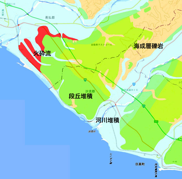 日高の広い馬牧場は,広大な段丘堆積平地のおかげ。