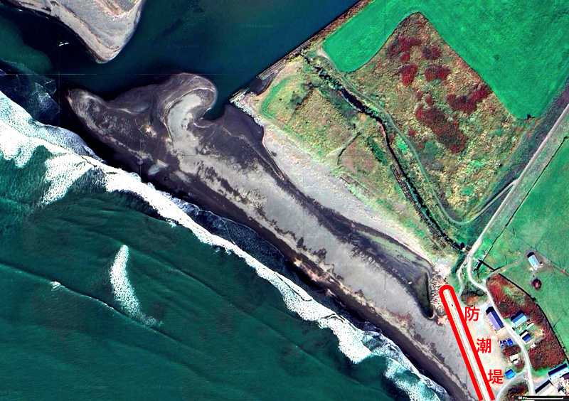 「海上の堤 (ridge) と以前の砂浜の間 (runnel) が埋められて,今の拡大した砂浜になった」 いまの沙流川は,河川敷 (土手で挟まれた域) の中の流れを,さらにその両岸を河口まで護岸することで,固定している。 しかし,河口は土石の堆積で浅くなり詰まるものなので,その上を通る川の流れは細くなる。 その流れは,土石の堆積と相互作用する。 こうして,流れの向きは一定しない。 また,増水すると,堆積した土石が海に押し出され,河口の形が大きく変化する。 そして以上に伴い,沙流浜の形・面積が変化する。 |