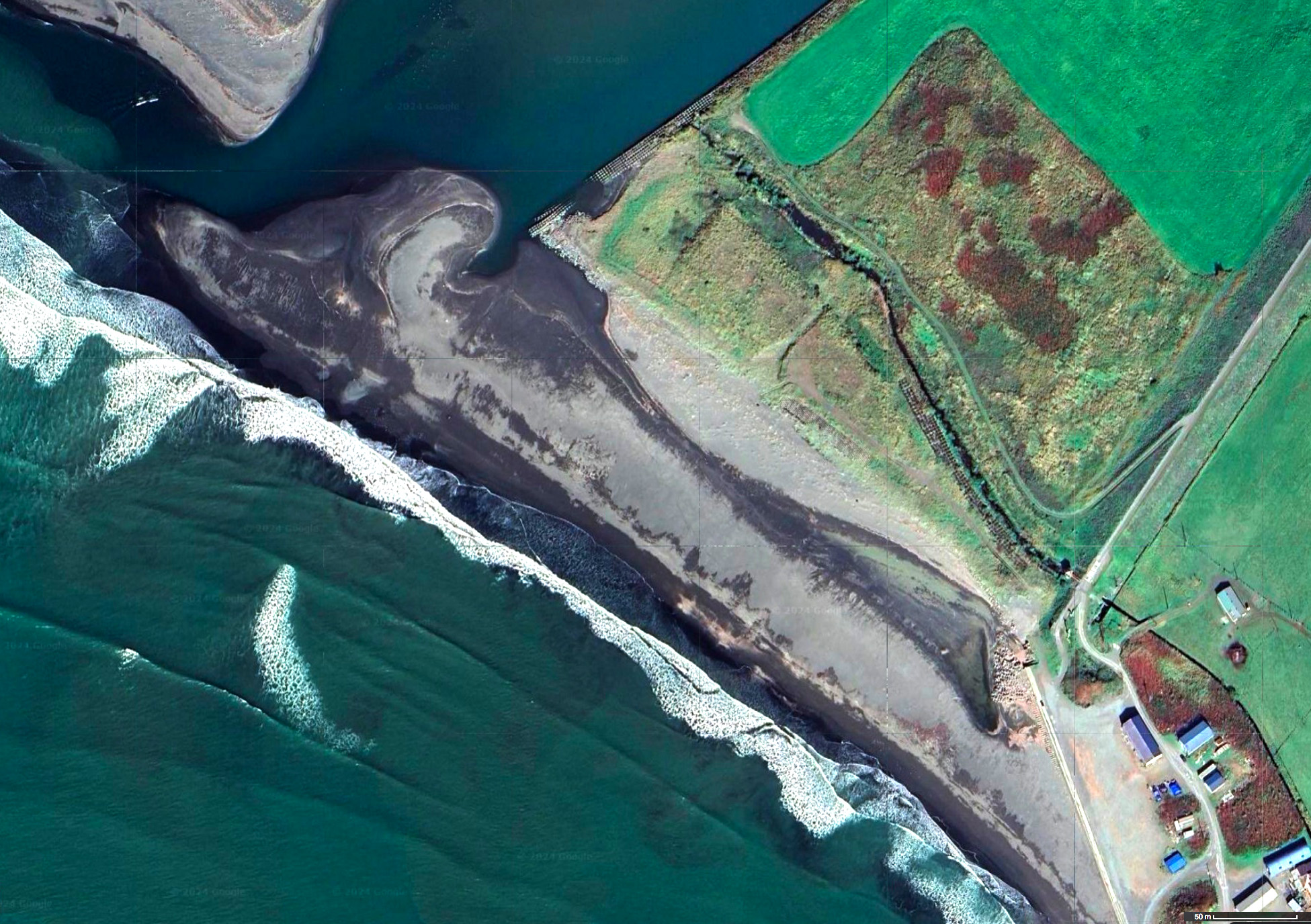 堤 (ridge) が形成されているのであった。 この時以降,沙流川が河口に運んできた土石は,この堤と岸の間の浅水域 (runnel) に運ばれることが多くなったと考えられる。 その浅水域は次第に土石で埋まり,ついに一続きの浜になった。 つぎは,Google Map で現在 (2024-05-27) 表示される沙流川河口域。 Google Earth でも同じものが表示され,作成が 2023-10-15 となっている。 いまは,これとは変わっている。 |