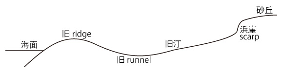 いまこれは,明瞭には無い。 新しい岸から一旦下りそれから砂丘へと上る凹傾斜 (berm) に変わっている: |