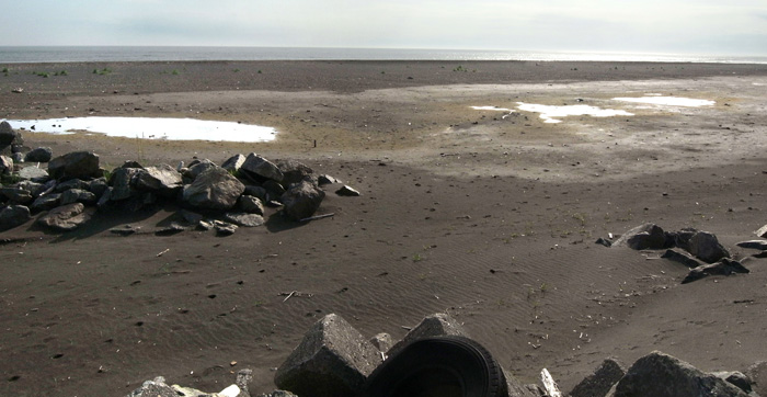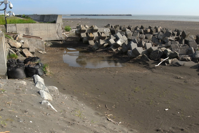 特に防潮堤の近くは,土石の堆積が少ない分,地下水位が高い。 潮位が上がると,地下水が地表に浮き上がってくる。 |