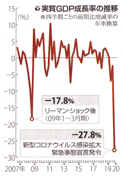 新型コロナウイルスの感染拡大で、リーマン・ショック後の09年1〜3月期 (年率17.8%減) を上回り、戦後最大の落ち込みとなった。