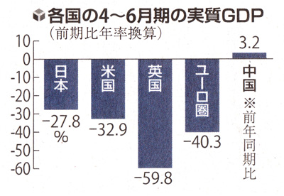 他の先進国の実質GDPを見ると、前期比の年率換算で米国は32.9%減、独仏などのユーロ圏19か国は40.3%減、英国は59.8%減だった。