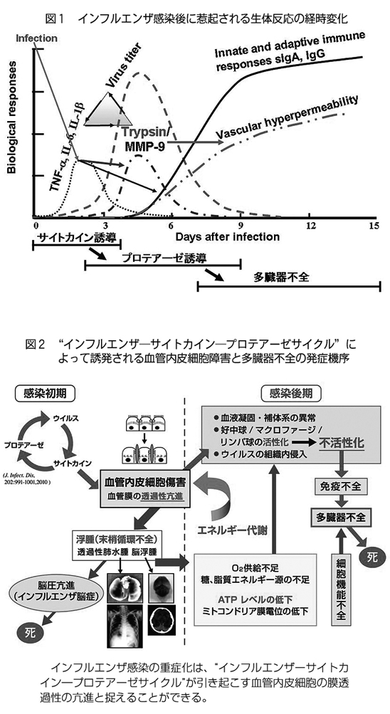 図2は、「インフルエンザ−サイトカイン−プロテアーゼサイクル」と血管内皮細胞障害の関係を図示したものである。