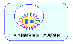 (4)食胞内が酸性化すると、ウイルスの活性化HAの膜融合活性により、食胞の膜とウイルスの