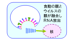 (5)膜融合により細胞内に侵入したウイルスは、自分のRNAを放出して細胞の核に送り込み