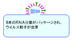 (7)作られたウイルスRNAは8本づつセットになって取り込まれ、新しいウイルスとして