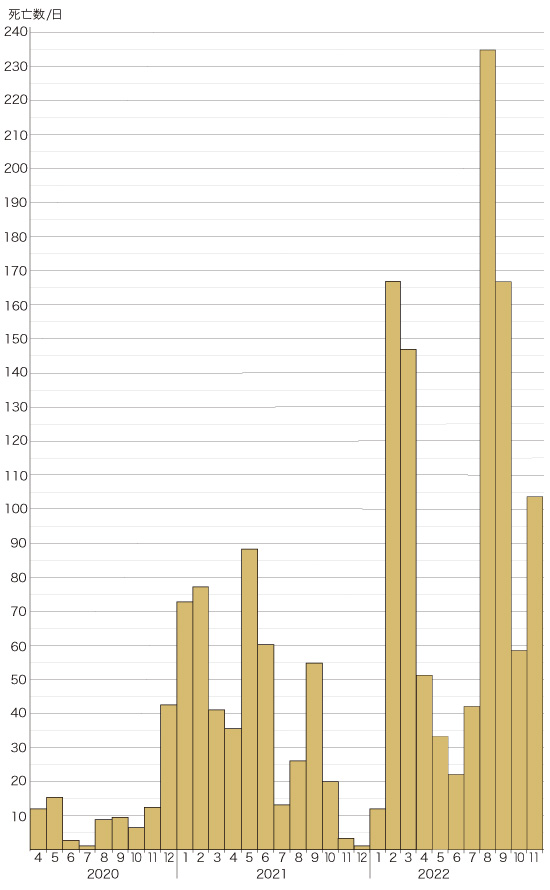 Up 死亡数の推移 (累計と1日あたり) : 2022-11-30 まで 作成: 2022-12-02