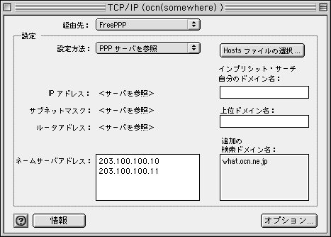 「TCP/IP コントロールパネル」には,このネームサーバの IP アドレスを書くフィールドがあります。