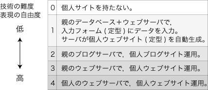 子は,自分のウェブサイトを設ける。 全体を一つのシステムと見たとき,「子のウェブサイトをモジュールにする」がこのシステム設計の方法になっている。 では,モジュールである「子のウェブサイト」は,どのように実現されるものか? これについては,つぎのような段階が考えられる: ![]()