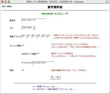 データベース化しておくと,データのいろいろな切り方ができる。(教員個人ごと,セクションごと,機種ごと,固定IP/DHCP の別,等)