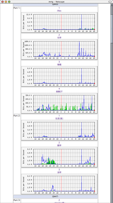 ツール自体は単純であり,基幹ルータ (Cisco 7505),センタスイッチ (Alpine 3904),各フロアスイッチ (Cisco 2950/3524XL) のすべてのポートにつき,それを操作パネル的に table のセルで表現し,セルのクリックでトラフィック表示のページへ跳ぶようにしたもの,および,ポートのトラフィックが「グラフの対照」という形で表示されるようにしたものである。