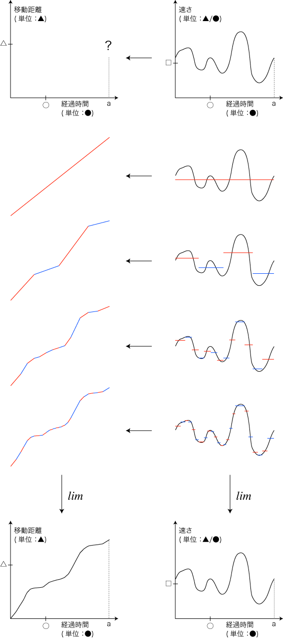 そこで,「時間の区分を細かくする」によって近似の精度を上げていったときの極限は,lim の記号を用いたつぎの式になる: