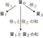 量の加法 +,量に対する数の倍作用 x,数の加法+・乗法x の間の関係 | ||||