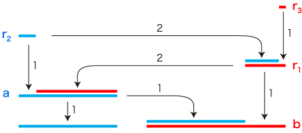 いま,正方形の辺と対角線の長さ,互除法の中で現れる余りの線分の長さに,つぎのように記号をあてます: