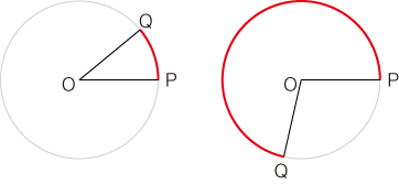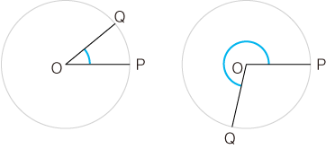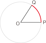 わたしたちの気持としては,つぎの青線で示されるものを「角度」としたいわけですが,この曖昧な青線を退けるところに「弧度法」の意味があるわけです。 ![]()