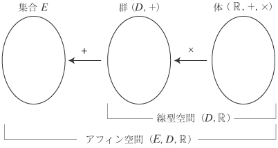 (註2) 記述の上では,アフィン空間Eがベクトル空間D込みで成立する概念であるのに対し,ベクトル空間Dはアフィン空間の概念を要しません。しかし,“現空間”の契機ということでは,EとDは同時です。