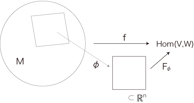 しかしここでは,「ベクトル場」と「テンソル場」の間に,「マトリクス場」をはさむことにする。 この構成は,教育的観点から行うものである。 「テンソル」の学習者は,「テンソル」とは何かをわからずに過ごす者である。 こうなるのは,「テンソル」の教授の仕方──それは「テンソル」を「マトリクス」と混同させるだけの教授の仕方──に原因がある。 実際,「マトリクス」を「テンソル」の意味にしているテクストもあるくらいである。 そこで,「テンソル」の前に「マトリクス」を取り上げることで,「テンソルはマトリクスのことではないよ」を示しておこうというのである。 マトリクス (行列) は,線型写像の表現行列のことである。 したがって,「\(f\) 場」の定義図式 ![]() ![]() 「マトリクス場」とは,どんなふうのものか。 例えば,ある時点での \(M\) の各点 \(x\) の気圧を記述することを考える。 気圧は,空気の単位体積あたり重さで表現できる。 各気圧は \(Hom(体積, 重さ)\) の要素である。 そこで,\(M\) の各点 \(x\) の気圧を記述することは,\(M\) から \(Hom(体積, 重さ)\) への関数fを立てることである。 そして \(M\) は,「\(f\) 場」として,マトリクス場である。 |