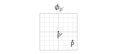 実際,「地図を接ぐ」は「座標の保持」の上に可能になることである。 地図を接ぐ旅は,座標を接ぐ旅である。 \(P'\) に着いたわたしは,地図 \(\phi_P'\) を作成する。 このとき \(\phi_P'\) のデカルト座標は,保持してきたデカルト座標の原点を \(P'\) に措いたものである。 \(P'\) は \(P\) から近い点を選んでいるので,\(\phi_P'\) には \(P\) が載ることになる。 ![]() |