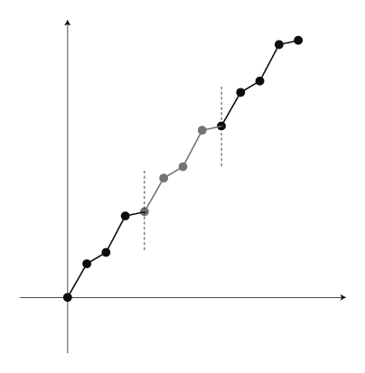 「微分積分」は,2つの順序稠密量の間の関数から,論を開始する。 例えば,「速さ」が,<時間>と<距離>の間の関数として,素材になる。 「平均」は,2つの離散量の間の関数から,論を開始する。 例えば「得点力」が,「試合ごとの集計」の形で,<試合数>と<得点>の関数として,素材になる。 「試合ごとの集計」には,2タイプの記述法が立つ。 「この試合終了までで累積何点」と「この試合は何点」である。 二つの記述は,互いに他から導ける。 前者から後者を導くのが,「微分法」である。 そして,後者から前者を導くのが,「積分法」である。 つぎに,二つのチームA,Bの得点力の比較を,主題にする。 比較の方法は,A,Bそれぞれで,集計データを「試合数−累積点数」の積分グラフに表し,そしてこのパターンをつぎのように繰り返し書き連ねてみることである: ![]()
