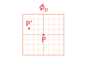 実際,「地図を接ぐ」は「座標の保持」の上に可能になることである。 地図を接ぐ旅は,座標を接ぐ旅である。 \(P'\) に着いたわたしは,地図 \(\phi_P'\) を作成する。 このとき \(\phi_P'\) のデカルト座標は,保持してきたデカルト座標の原点を \(P'\) に措いたものである。 \(P'\) は \(P\) から近い点を選んでいるので,\(\phi_P'\) には \(P\) が載ることになる。 ![]() |