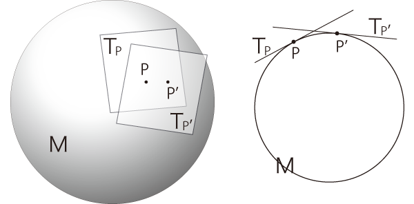 これが騙しであることは,「3次元多様体の接ベクトル空間──3次元」の概念にきちんと対すれば,わかる。 そもそも,接ベクトル空間は,土台の空間からはみ出る存在になる。 接点に立てたデカルト座標の軸は,空間の外側に出ていく,ということである。 ![]() 3次元でこの様を思い描けるか。 3次元では,「デカルト座標の軸は空間の外側に出ていく」は思い描けない。 優先されるのは,この常識の方である。 即ち,つぎのように考えることになる: