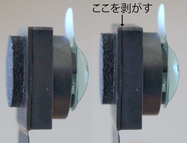 切れ目にカッターナイフの刃先を入れて,レンズ部を剥がし取る。
