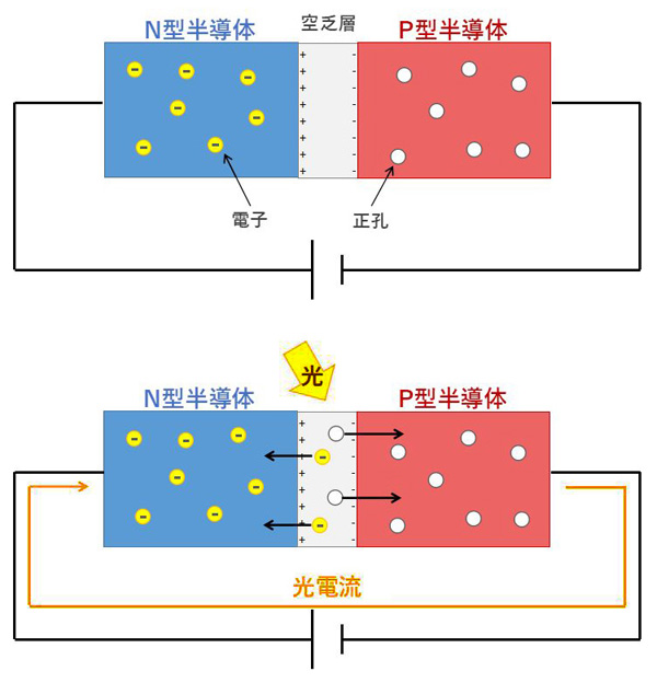 光半導体素子のPN接合部に光が照射されると,電流や電圧を発生